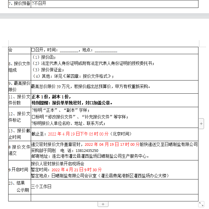 密封报价开启时间及地点:2022年04月21日前,如有特殊情况时间另行通知。