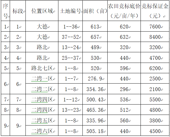 一、竞标农田标段、位置、面积、竞标底价、竞标保证金: