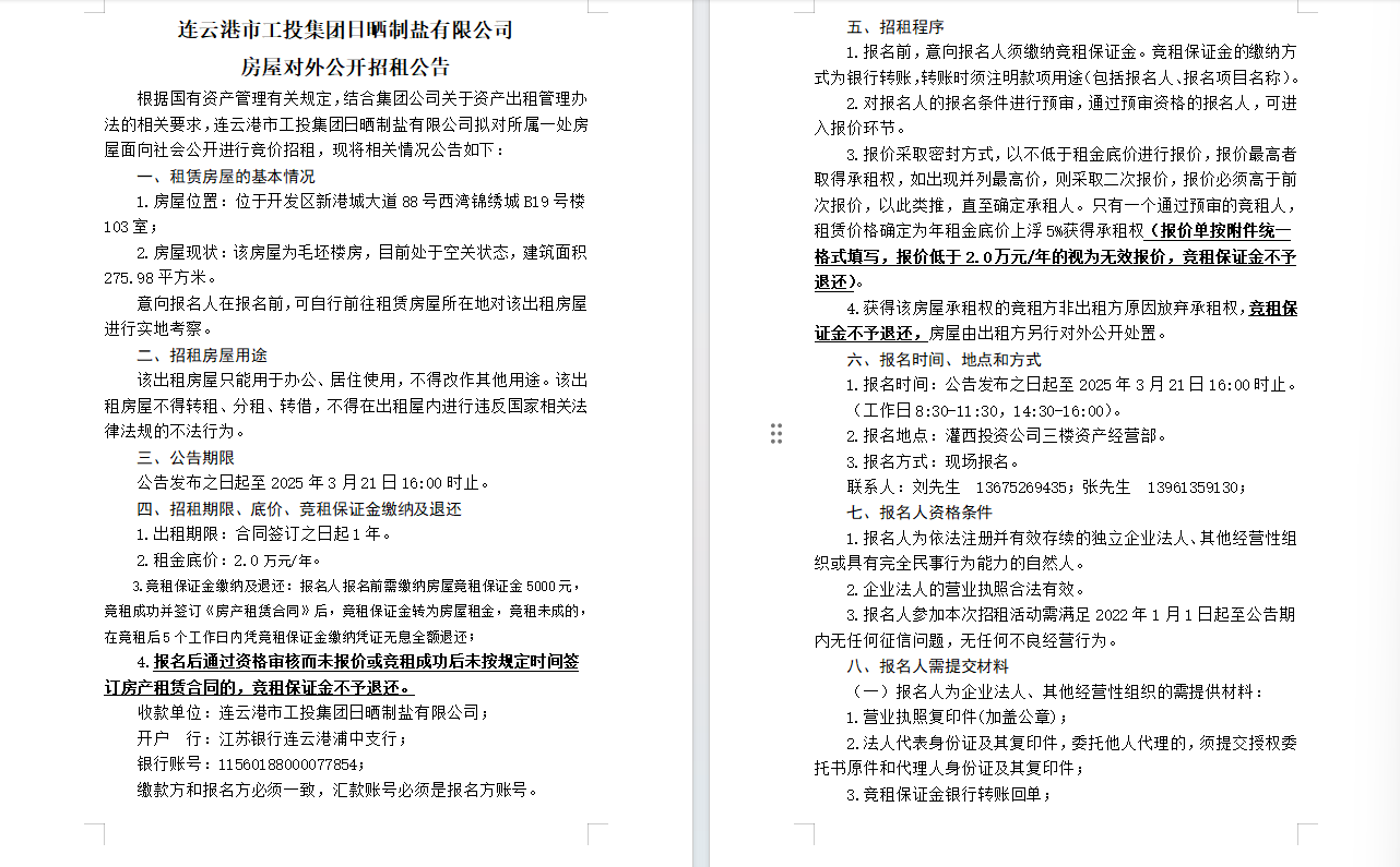 连云港市工投半岛平台网站登录入口_半岛(中国)日晒制盐有限公司房屋对外公开招租公告