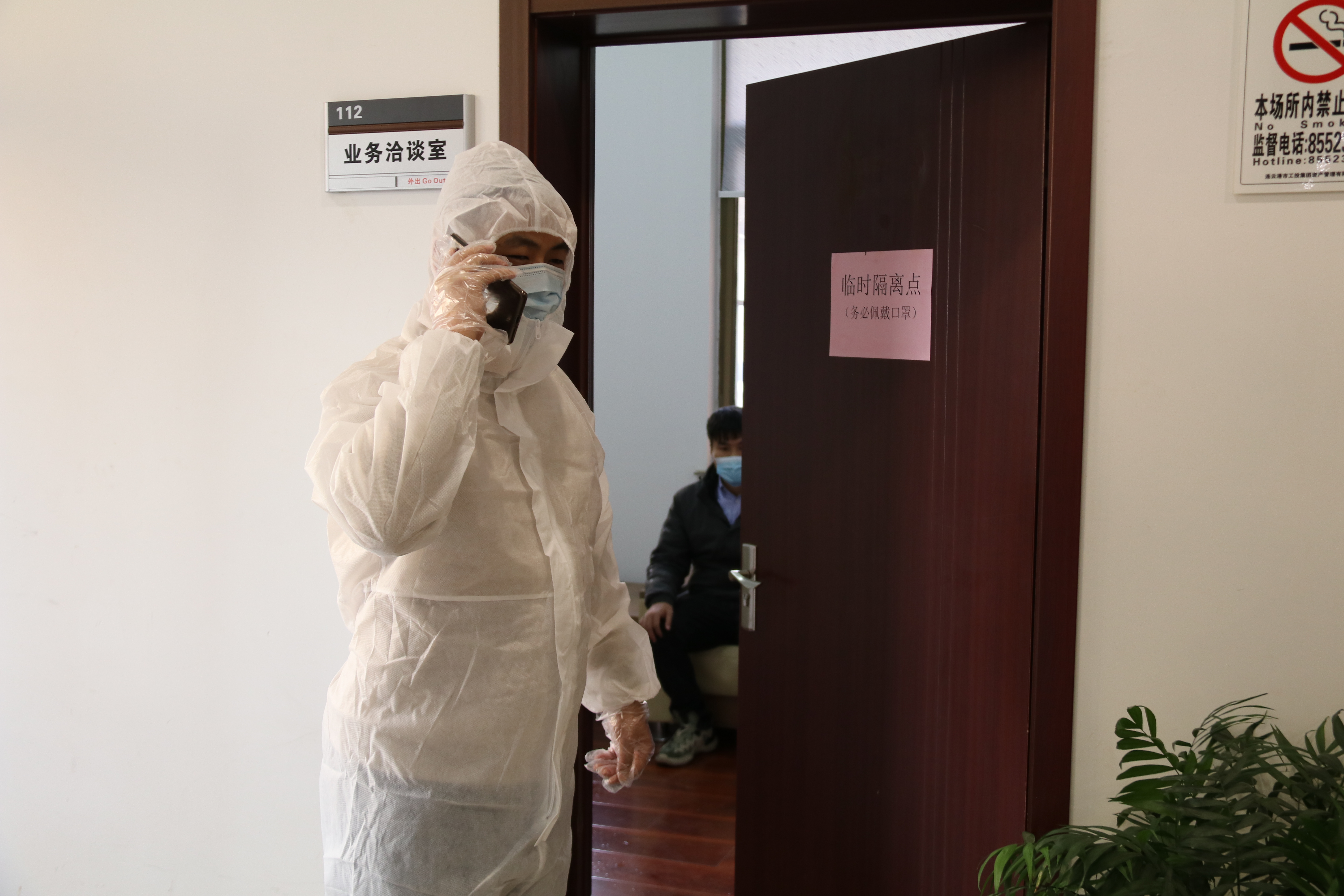 下午3时左右演练正式开始,公司提前制定了新冠肺炎疫情应急处置预案,先后完成桌面推演和实战演练。演练模拟在办公楼进门处发现异常发热员工后,上报疫情防控领导小组,防控小组迅速行动,对发热员工进行调查、登记、隔离、转运,并对相关场所进行消毒工作等应急处置措施。