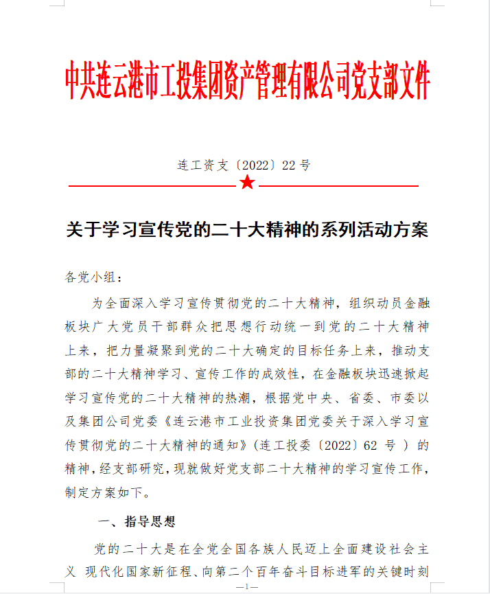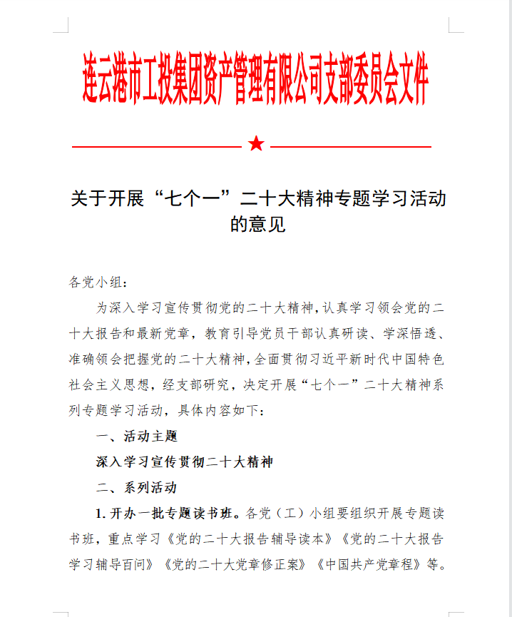 为在金融板块快速掀起学习宣贯党的二十大精神热潮,支部精心组织、积极筹划,完善学习方案,创新学习教育形式,丰富党建活动载体,支部结合公司实际,专门制定《学习宣传贯彻二十大精神学习方案》、《关于开展“七个一”二十大精神专题学习活动的意见》。