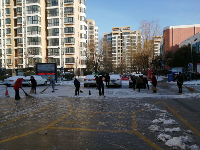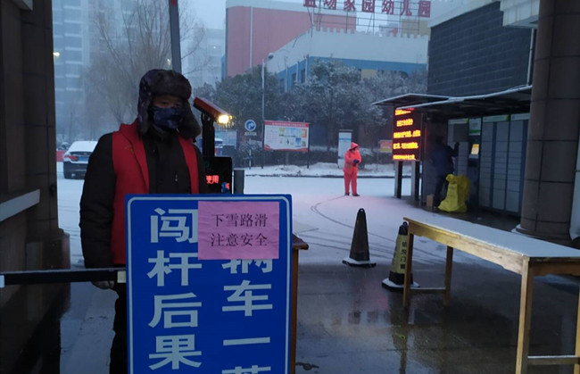 作为公司职工居住的盐场家园小区,按照金海社区要求,执行封闭管理,每户只发一个通行证,除门卫外,管理人员全部参与轮流值班。特殊天气时,大门的看守更加严格与认真,值班人员对过往的人员登记、量体温,确保没有问题后才给与放行。大雪洋洋洒洒,清晨的盐场家园银装素裹,泰祥物业的工作人员,佩戴好口罩,拿着扫帚弯着腰,挥动手中的工具在清理积雪。雪已结成冰,但他们不畏寒冷,坚毅有力,铲掉冰冻。寒冷的天气,丝毫没有影响大家的热情,先主路后支路,逐渐扫出一条整洁的路面,疫情面前,泰祥物业人用行动用严格用责任温暖了业主的心。