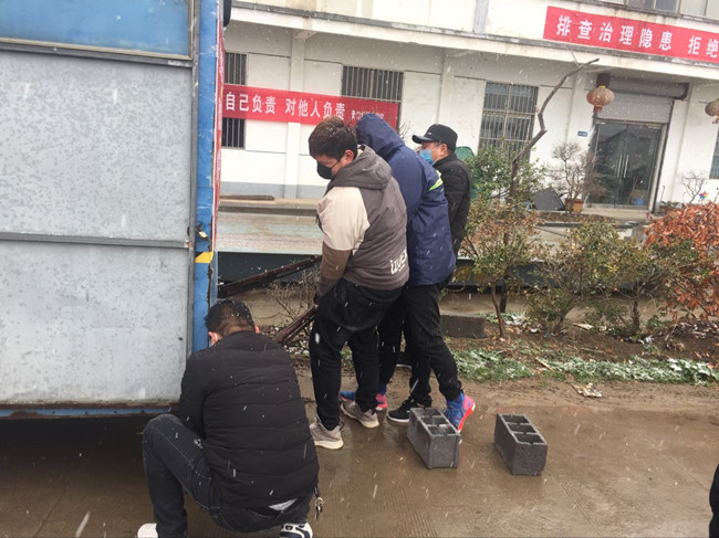 公司党委书记、董事长胡传法冒雪检查成业饲料卡口,胡书记嘱咐在现场值班的团青干部防控一线,要动真格不能含糊,坚决不给外来车辆通过。负责这里还有生产生活服务中心和黄沙分场的全体管理干部,大家都很辛苦,但没有埋怨,都在默默地坚守岗位,履行职责。你不站岗我不站岗,谁保卫咱大场他们是这样说也是这样做的。为了让值守人员有一个温暖的临时休憩的场所,泰祥公司将一个临时集装箱拉到卡口,后勤班的小伙子们,搬运调试固定,丝毫没有因为寒冷的天气影响工作进度。