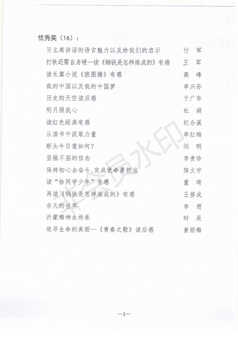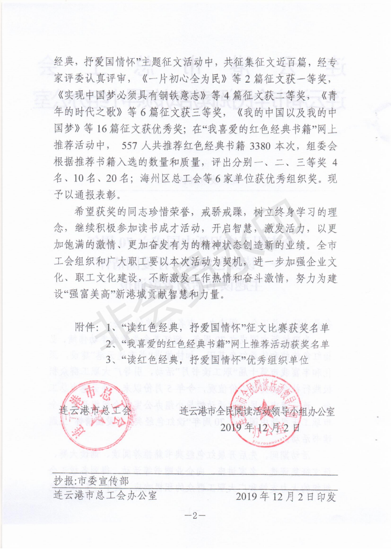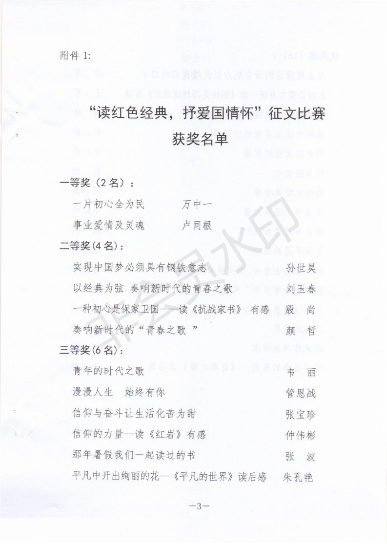 在全市职工庆祝新中国成立70周年“读红色经典,抒爱国情怀”主题征文活动中。经专家评委认真评审,我公司三位员工的文章获得奖项,其中,万中一的《一片初心全为民》荣获一等奖;仲伟彬的《信仰的力量-读《红岩》有感》荣获三等奖;杜娟《明月照我心》荣获优秀奖。