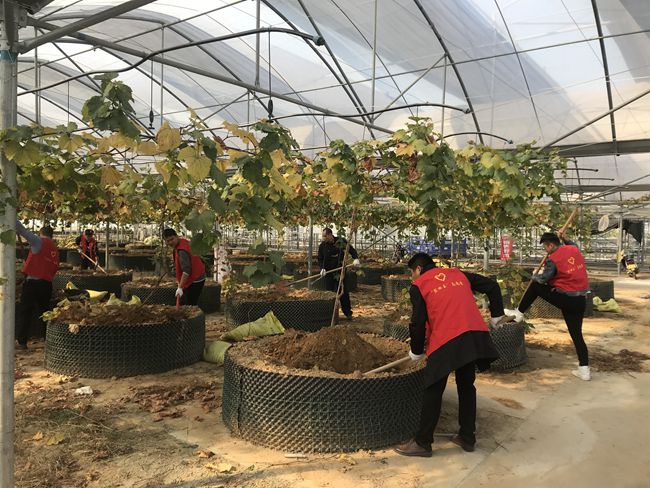 10月30日上午,青口投资公司团委组织团员青年前往育秧大棚参加志愿服务,对200株限根葡萄施用有机肥,为来年挂果丰收蓄力。 (团委)