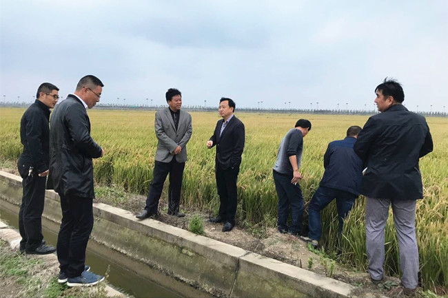 10月16日,苏粮半岛平台网站登录入口_半岛(中国)盐城江海粮油有限公司总经理宋俊成一行来我公司考察调研水稻种植情况,公司党委副书记、副总经理史祥平,党委委员、副经理周绪祥陪同考察。