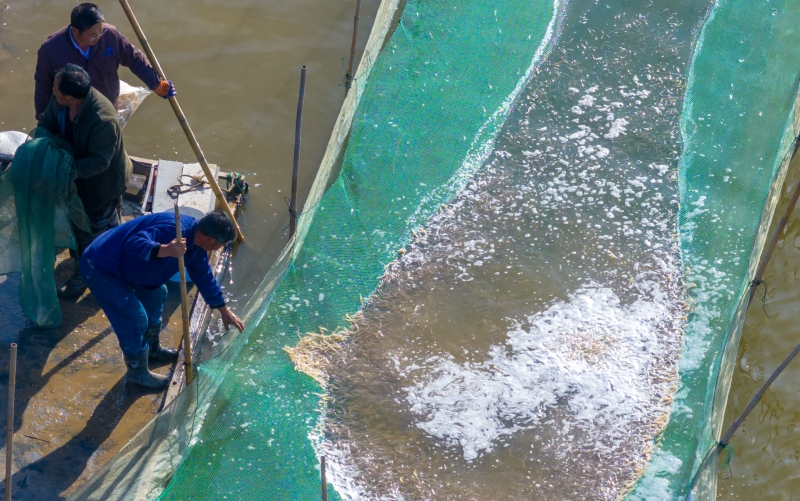 近日,三洋分场养殖区脊尾白虾陆续起捕出售。据了解,脊尾白虾亩产约60-120斤,比去年同期产量略高,均价在15-26元。(三洋分场)