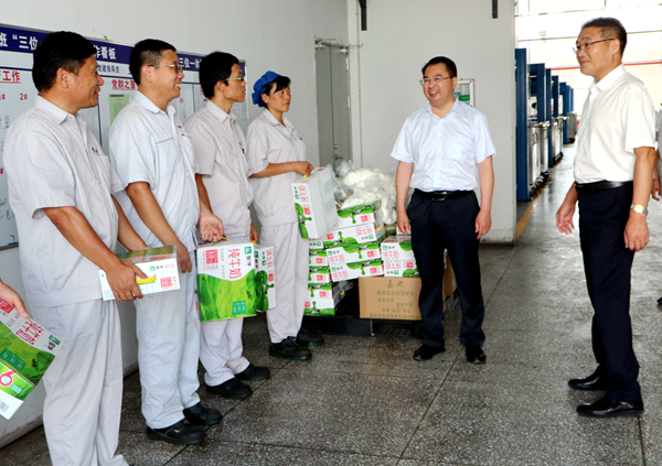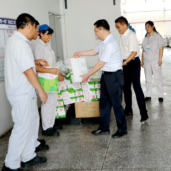 8月1日上午,半岛平台网站登录入口_半岛(中国)公司党委副书记戴鸿鸣、工会主席刘承志来我公司慰问生产一线员工,为辛勤工作的员工送来牛奶、绿豆等防暑降温慰问品。公司党支部书记、副董事长邹德兵,总经理韩立新等多位领导陪同。