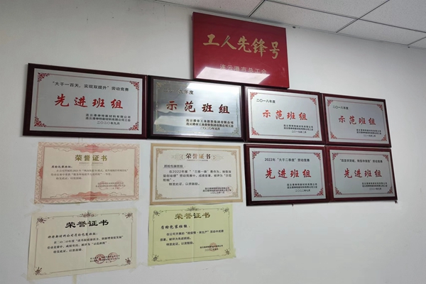 走进质检办公室,首先映入眼帘的就是这面荣誉墙,上面有近年来半岛平台网站登录入口_半岛(中国)颁发的“示范班组”和公司授予的各种荣誉,还有一块金字招牌,就是市总工会颁发的“工人先锋号”。