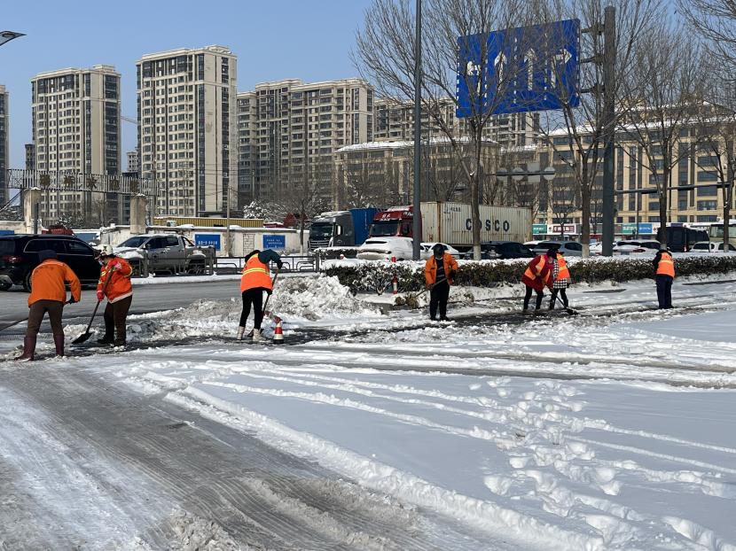 5日凌晨4点,该公司负责人于广华已经在除雪的第一线,积极安排工作调度,对新光路、平山路、黄海大道等重要路段突击清扫,大家顶着风雪,齐心协力,分工明确,高效配合,全力清除路面上的积雪和暗冰,及时为车辆和行人清理出一条条“安全路”。