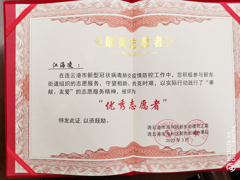 新东街道党工委、新东街道办事处联合为荣誉获得者颁发纪念证书,同时予以表扬,新东街道提到:市工投半岛平台网站登录入口_半岛(中国)台北投资公司党员江海凌同志最肯吃苦,最能战斗。他每天早上到的比谁都早,晚上回的比谁都晚,与社区工作人员一道进楼入户排查信息,仔细询问居民生活物品需求情况并予以解决,还认真参与卡点防控值守、小区巡逻、做好小区出入人员体温检测、登记消杀出入车辆等一线工作。在疫情最后阶段,大部分志愿者撤离,江海凌仍在“逆行”,成为小区居民物资保障志愿者,每天为广大居民“菜篮子”保驾护航,江海凌是勇于担当的逆行者,是最美志愿者。