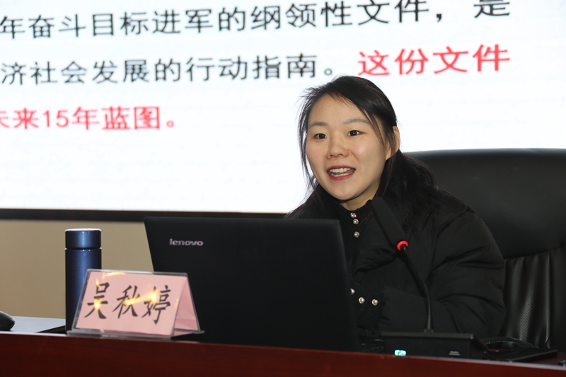 吴秋婷副主任在题为“开启全面建设社会主义现代化国家新征程”报告中,从新阶段与新目标、新理念与新部署、新变化与新格局等三个方面给大家解读了党的十九届五中全会精神。“新阶段与新目标”部分,介绍了我国在决胜全面建成小康社会取得的三大决定性成就,即十三五期间,全面深化改革取得重大突破;经济实力、科技实力、综合国力跃上新的大台阶。在“新理念与新部署”部分,从社会发展、创新发展、统筹发展等角度分别提出了习近平总书记在新时代下对中国共产党人的要求以及我国社会发展必须遵循的基本原则。在“新变化与新格局“部分,强调实现“十四五”规划和2035年远景目标意义重大、任务艰巨,但是前景光明,全党全国各族人民要紧密团结在以习近平同志为核心的党中央周围,同心同德,顽强奋斗,积极响应十九届五中全会对全党全国人民的号召,夺取全面建设社会主义现代化国家的胜利。