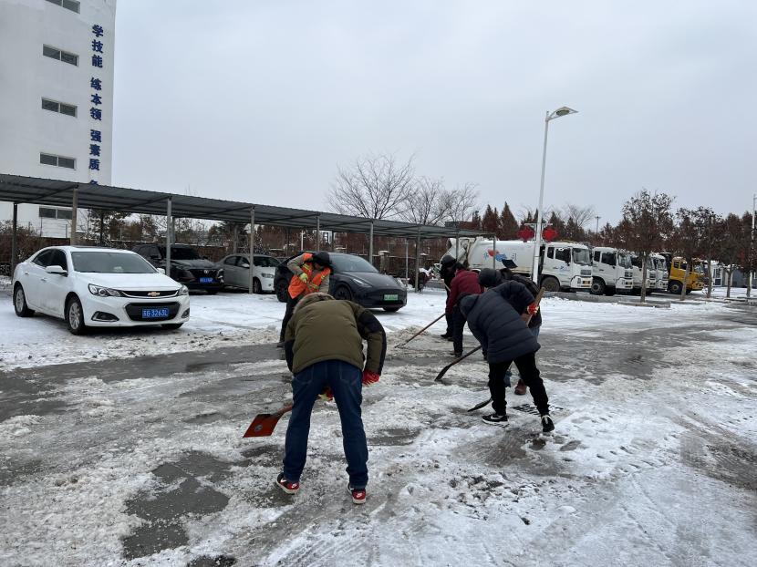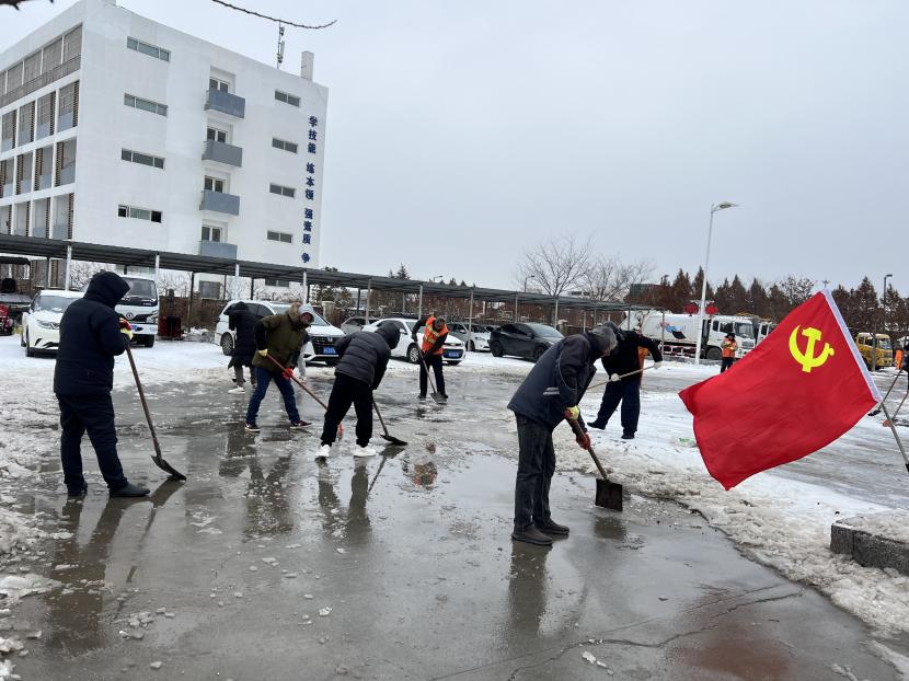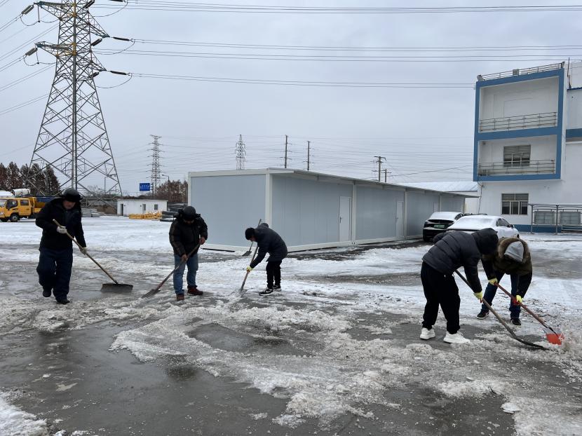 在清理工作现场,该公司负责人赵阳带领党员干部携带各种除雪工具,先后来到各自的责任区开始清除积雪,有的奋力泼洒融雪剂;有的拿着大板锹,推着积雪露出一道道干净的路面;有的在寒风中不停地挥舞着手中的铁锨,使劲清理着被汽车压结实的冰渣;有的将积雪一点点地集中到一起,然后用扫帚扫净路面,大家你铲我扫,团结协作,干劲十足,一片热火朝天的除雪景象。