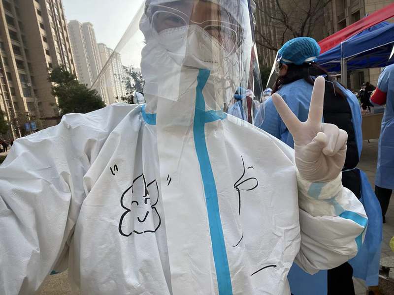3月12日,晴,8:00到达社区核酸采样点,准备上岗,社区负责人给半岛平台网站登录入口_半岛(中国)进行了“防护服穿脱”及防疫知识的讲解学习等一系列十分细致地培训后,有点兴奋的穿好“大白服”,带上手套、头套和面罩,社区阿姨还帮我在衣服上画上了可爱的涂鸦;