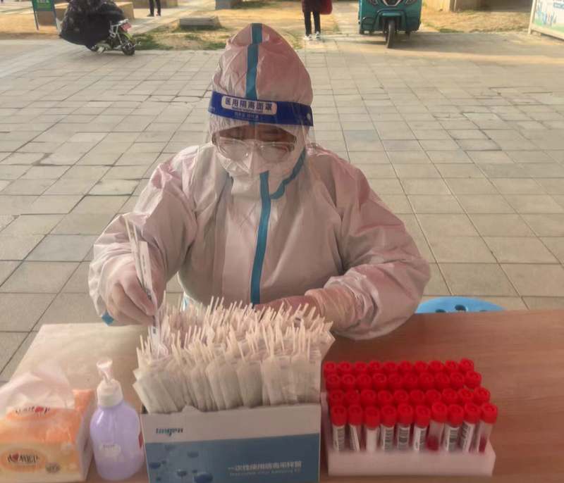 8:30,我被分配了协助医护人员进行核酸采样,在等待医生来的空闲时间,“偷默默”自拍了一张;