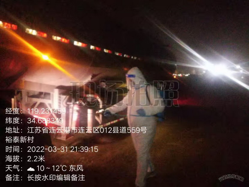 3月31晚8点48分,海州湾公司组织人员对盐城来企的钙液运输车辆进行消杀,对驾驶人员查验苏康码、行程码、核酸记录,登记到厂时间、车牌、始发地、所运物资等一系列车辆运输信息,并拍摄包含时间、车牌、封条的全方位照片上传闭环管理系统。