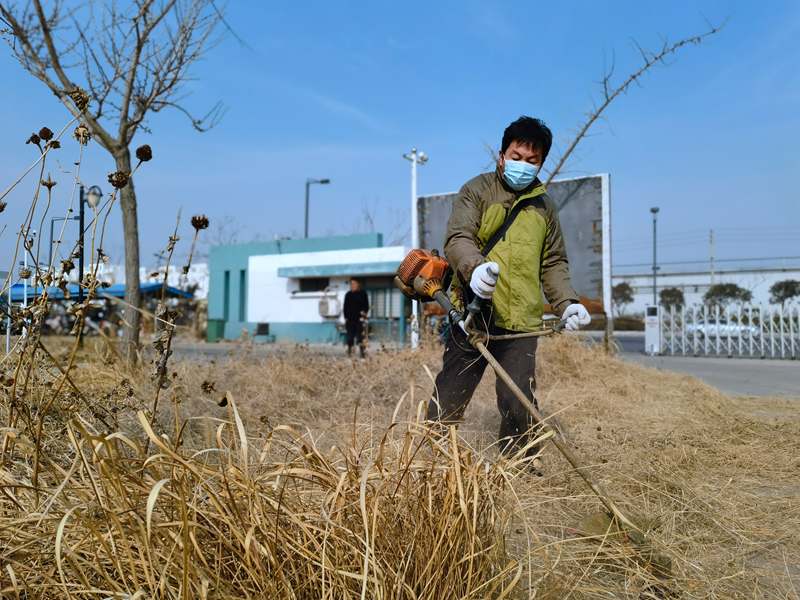 经验老道的“除草匠人”朱春华一马当先,一人成军,小小杂草在挥舞的打草机下“灰飞烟灭”