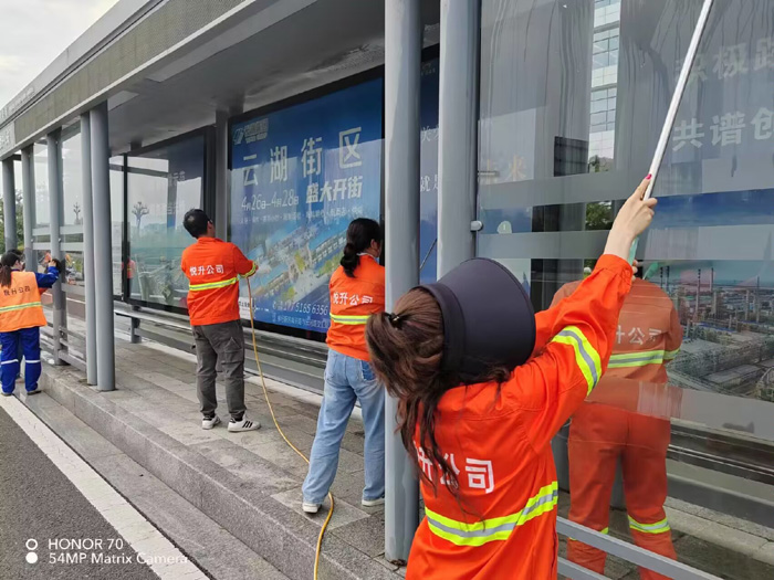 集中劳动“有力彰显”。学习活动结束后,保洁、机关党支部20多名党员汇集新区核心区域徐圩大道,南京路等路段,开展党员义务劳动。活动现场,大家分工明确,相互配合,无惧高温天气,上下挥动双臂,冲洗站台玻璃和清理广告标语,经过两个多小时持续奋战,徒手清洗站台20多个,座椅40多个。(杨波)