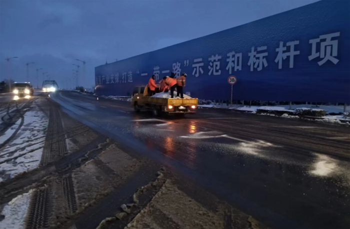 此次扫雪除冰行动共40余人参与,调派铲雪车、装载机等机械设备5台,调用融雪剂30余吨,采用人机结合方式,对主要干道人行便道、交叉路口等重要地段的路面冰雪进行人工突击清理;对所辖干道的桥面采用先雪铲车清理,后铺洒融雪剂相结合融化冰雪,循环进行。
