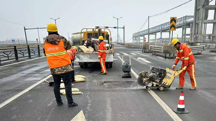 连日来,为了保障新区道路平稳畅通,市政分公司组织专业力量,分组开展坑洞修补。市政维修人员加班加点先后对港前大道、徐新路、海滨大道、石化区陬山路等重点道路大小坑塘30余处破损部位进行修补。